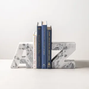 - Durability meets aesthetics in the marble A-Z Bookend Set. Made from high-quality white marble, these bookends are built to withstand the test of time, providing reliable support to your books for years to come. The sturdy construction guarantees that your books will remain secure and steady, preventing them from toppling over and maintaining their pristine condition.