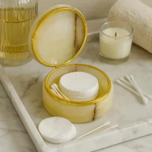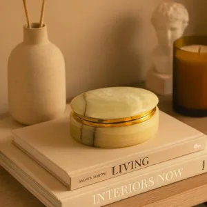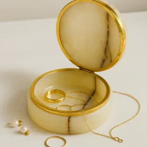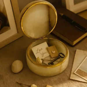 This elegant marble jewelry box is a timeless piece designed to bring both sophistication and function to your space. Crafted from genuine marble with natural veining, each box has its own unique pattern, making it a one-of-a-kind item. The smooth round design paired with a polished golden rim adds a touch of luxury, making it perfect for use on a vanity, dresser, or as a decorative accent in any modern or classic interior. Whether holding rings, earrings, or keepsakes, this box elevates everyday storage into something stylish and refined.