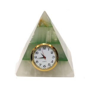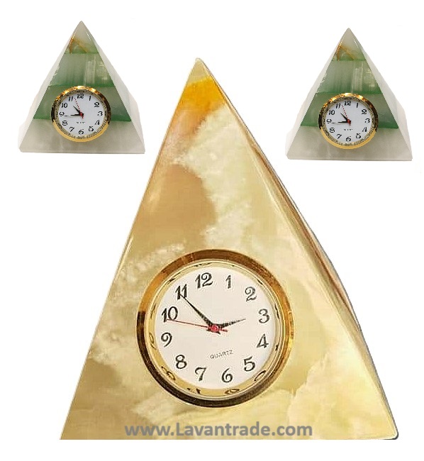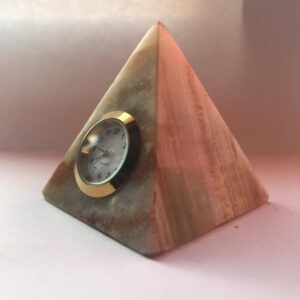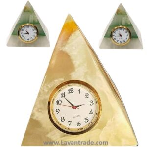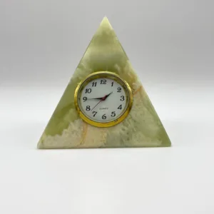Elevate your space with this stunning Onyx Pyramid Desk Clock. Crafted from genuine onyx stone, a semi-precious gemstone known for its beautiful colors and delicate translucence, each clock is a unique piece of art. The classic pyramid shape adds a touch of ancient mystique and timeless style, making it a perfect accent for any office, home, or workspace. This clock is not just a functional timepiece, but a beautiful and unique decorative item that makes a perfect gift.